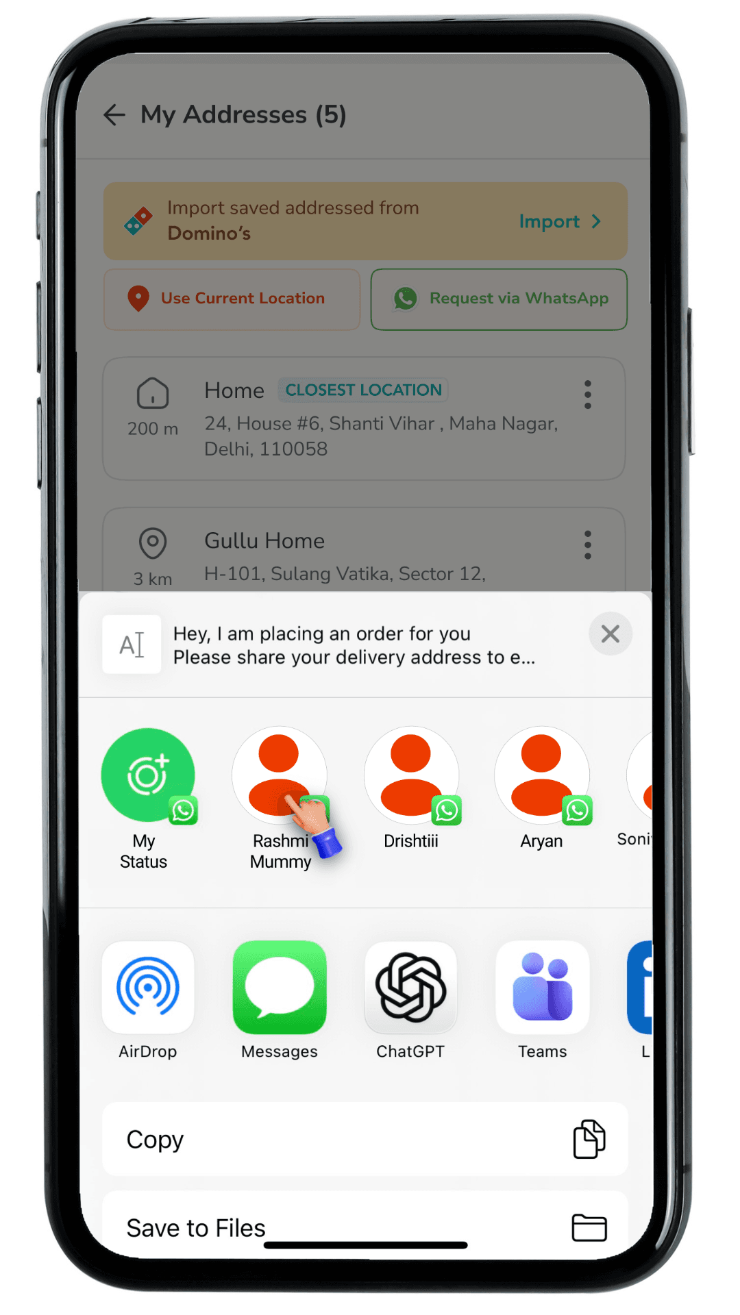 Ordering for others: Sharing an address over chat is manual and error-prone.