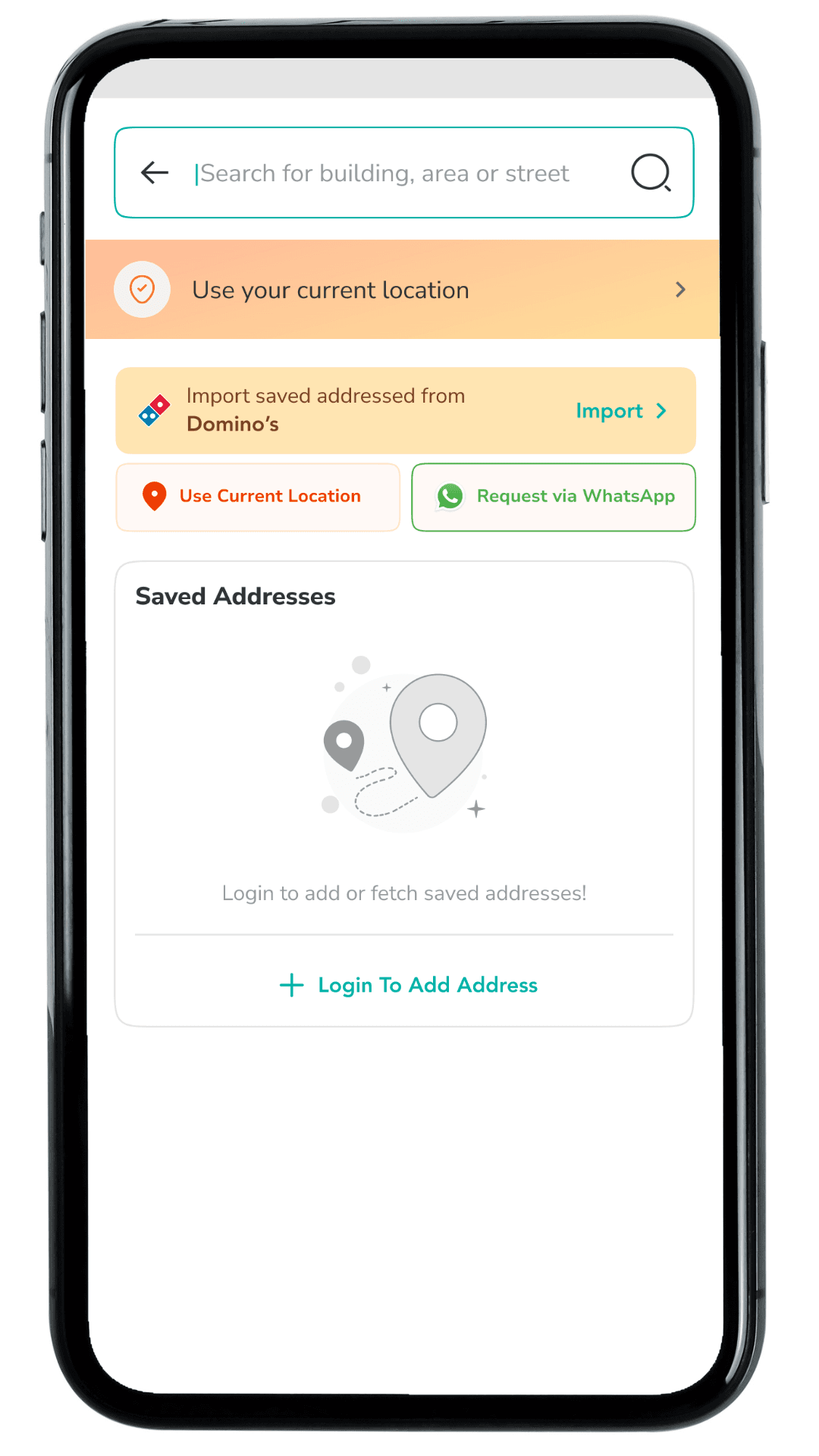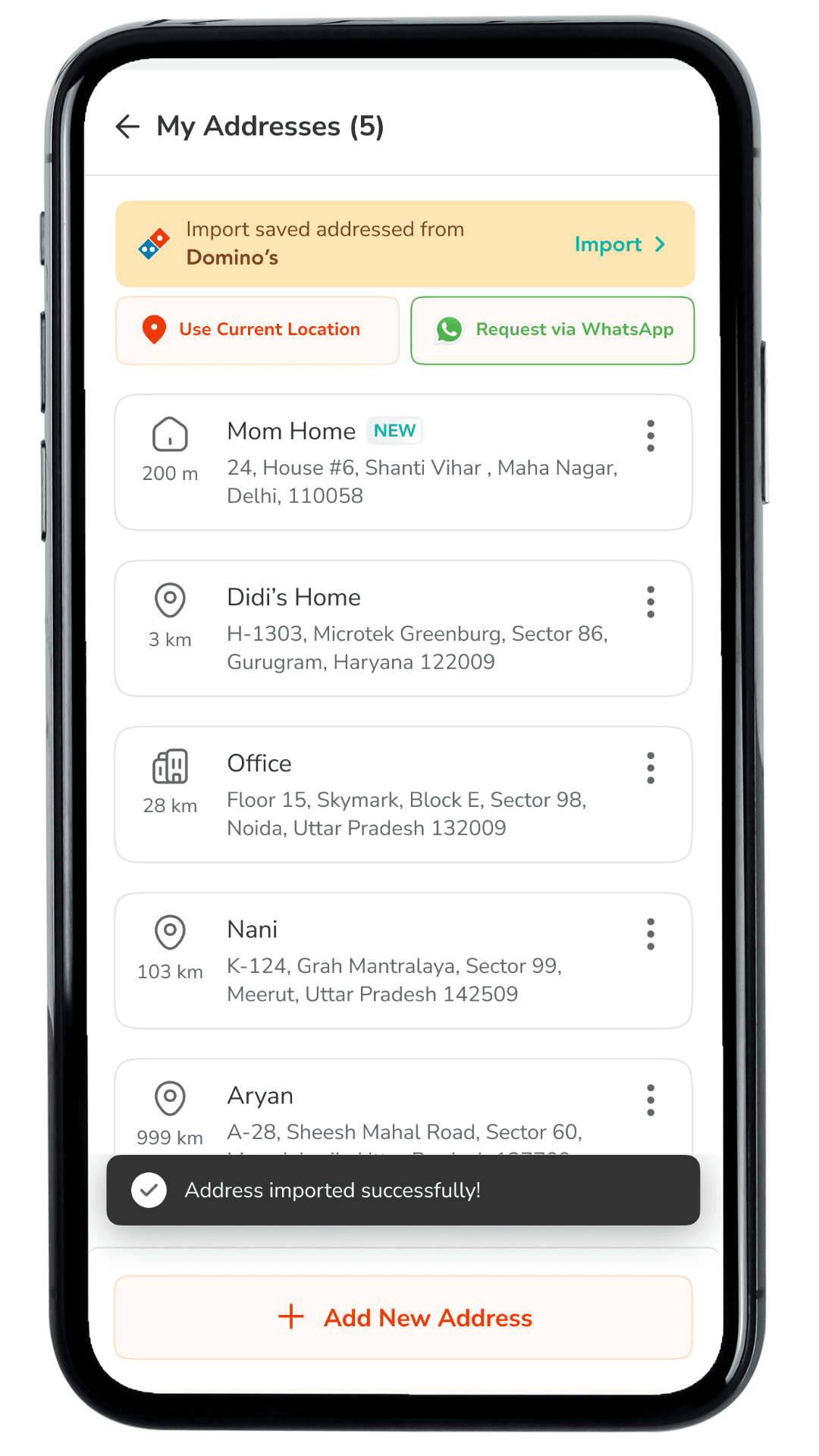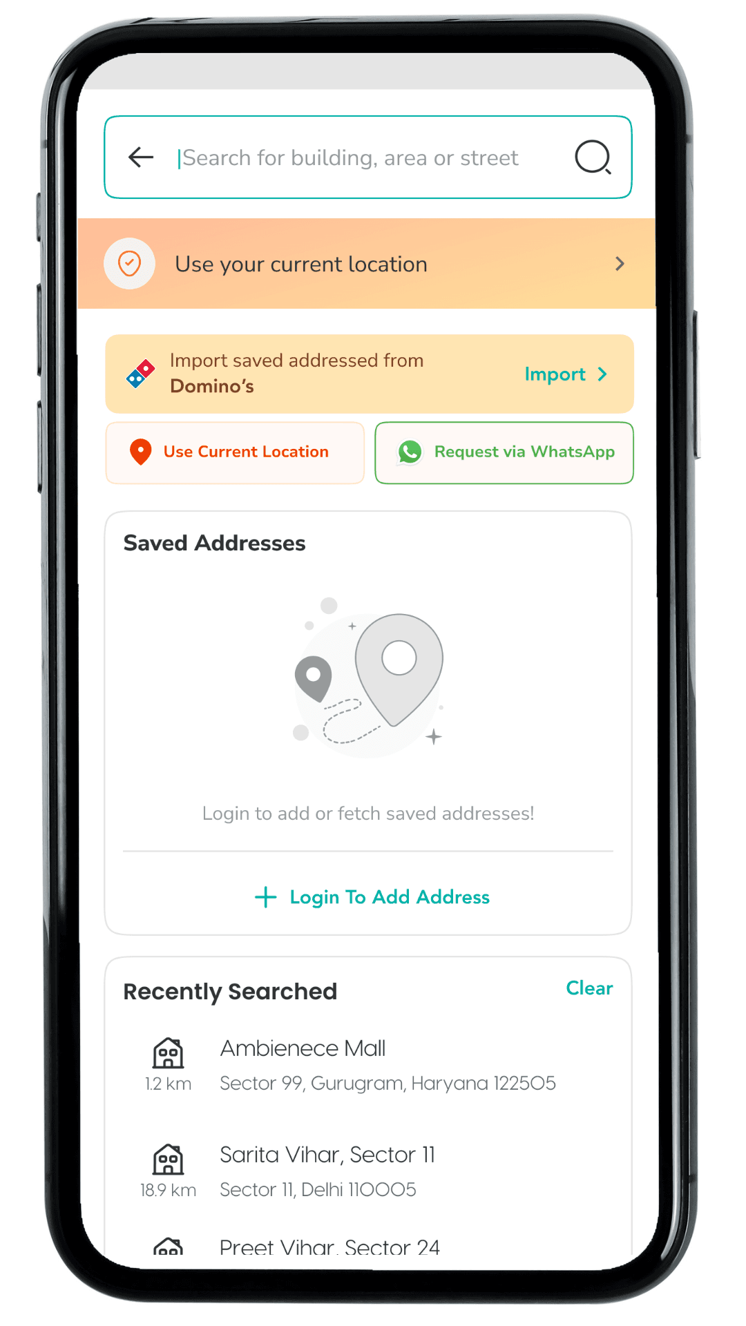 Add an entry point inside My Addresses and the Select an Address bottom sheet so users can import their Domino’s saved addresses without re-entering details. This supports first-time users of a new Jubilant brand app and speeds up address setup at the highest-intent stage.
