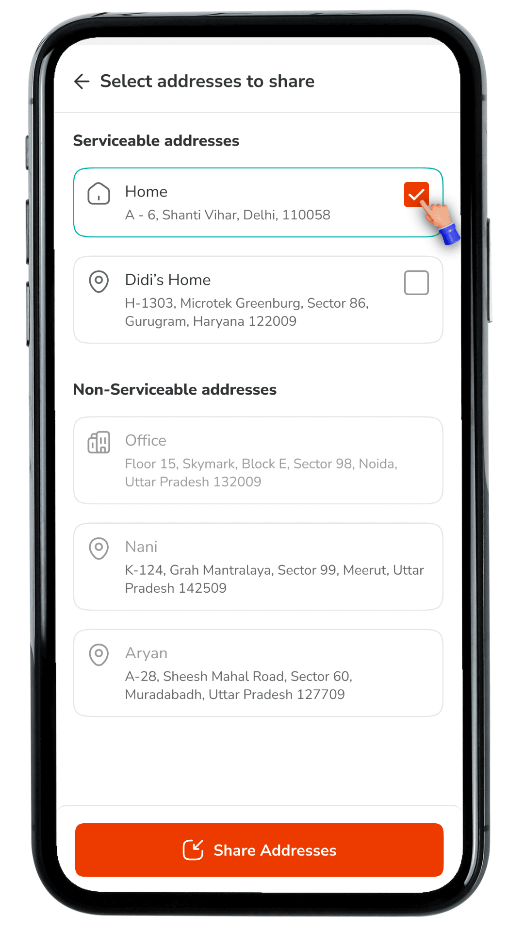 Address selected and shared successfully