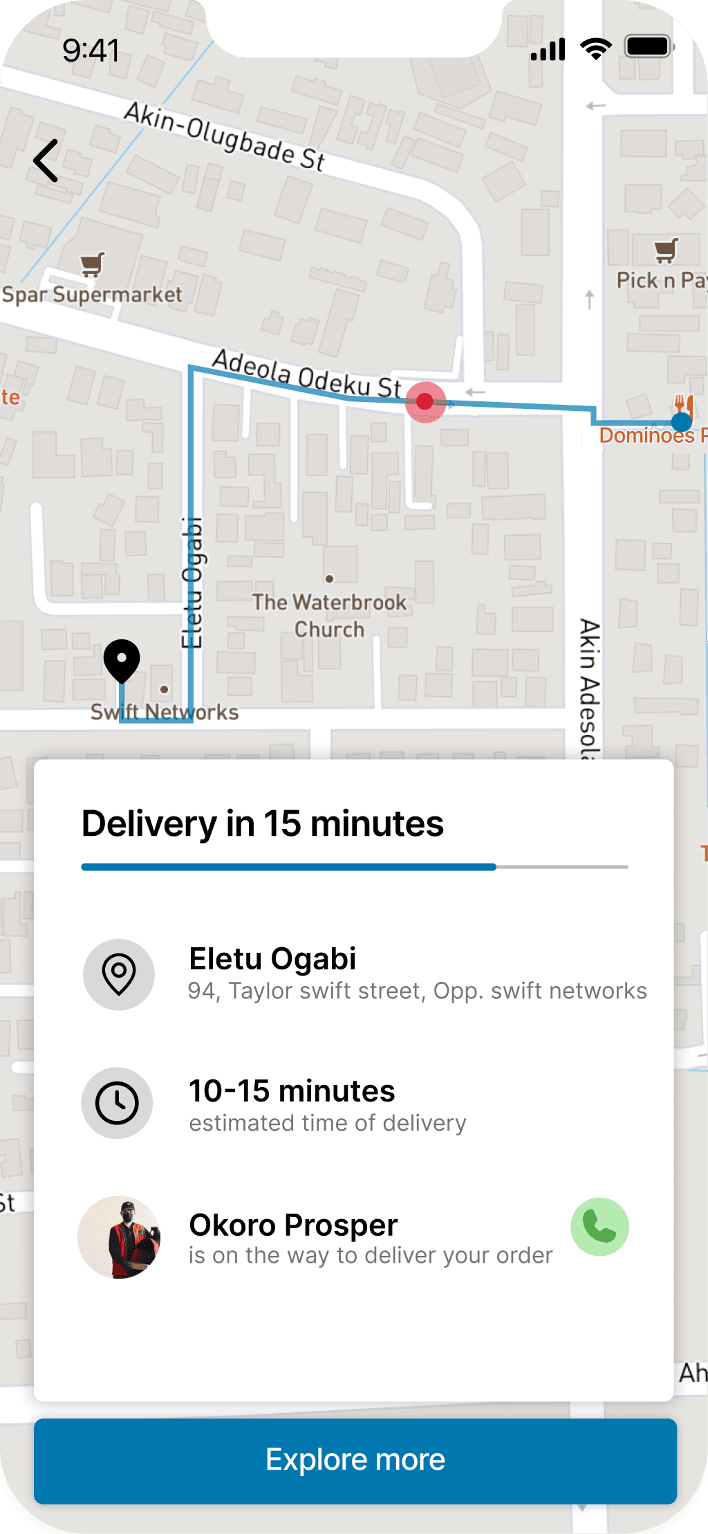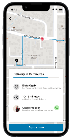 Featured a card that gives information about the assigned dispatch rider and an estimated time of delivery.