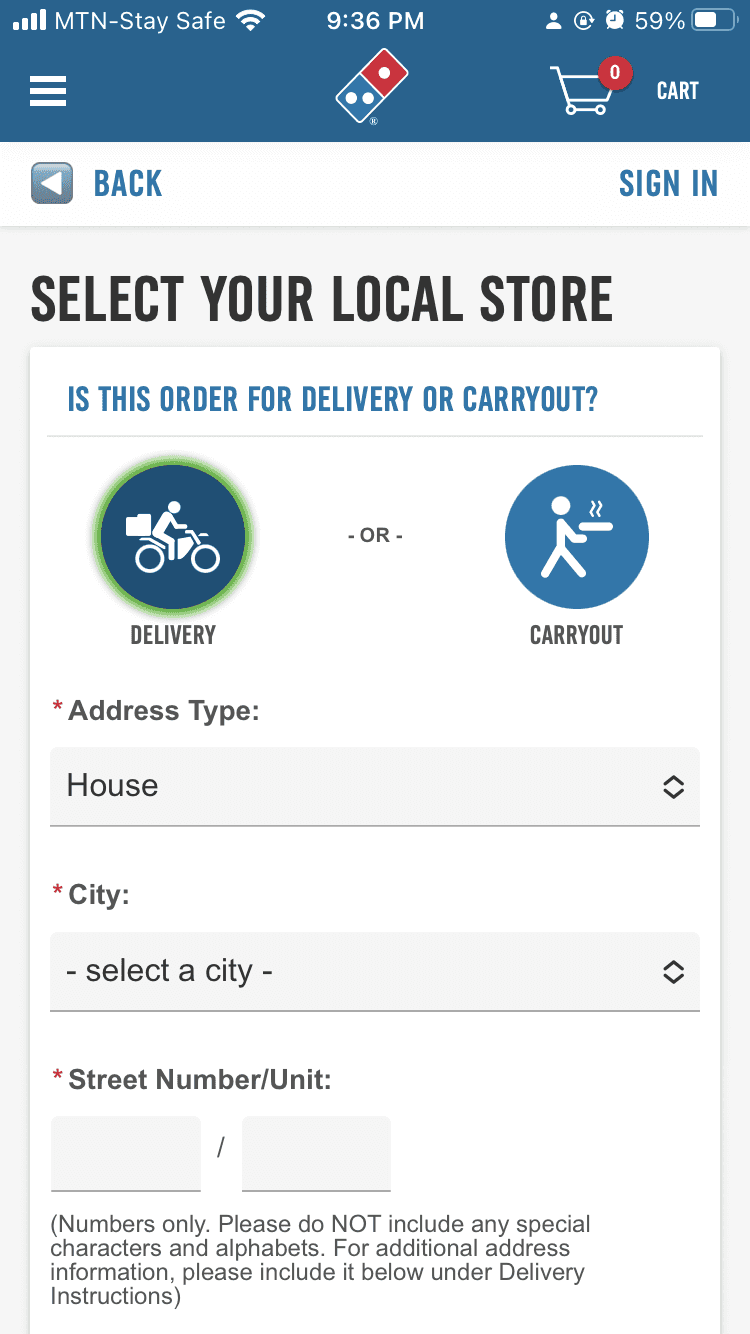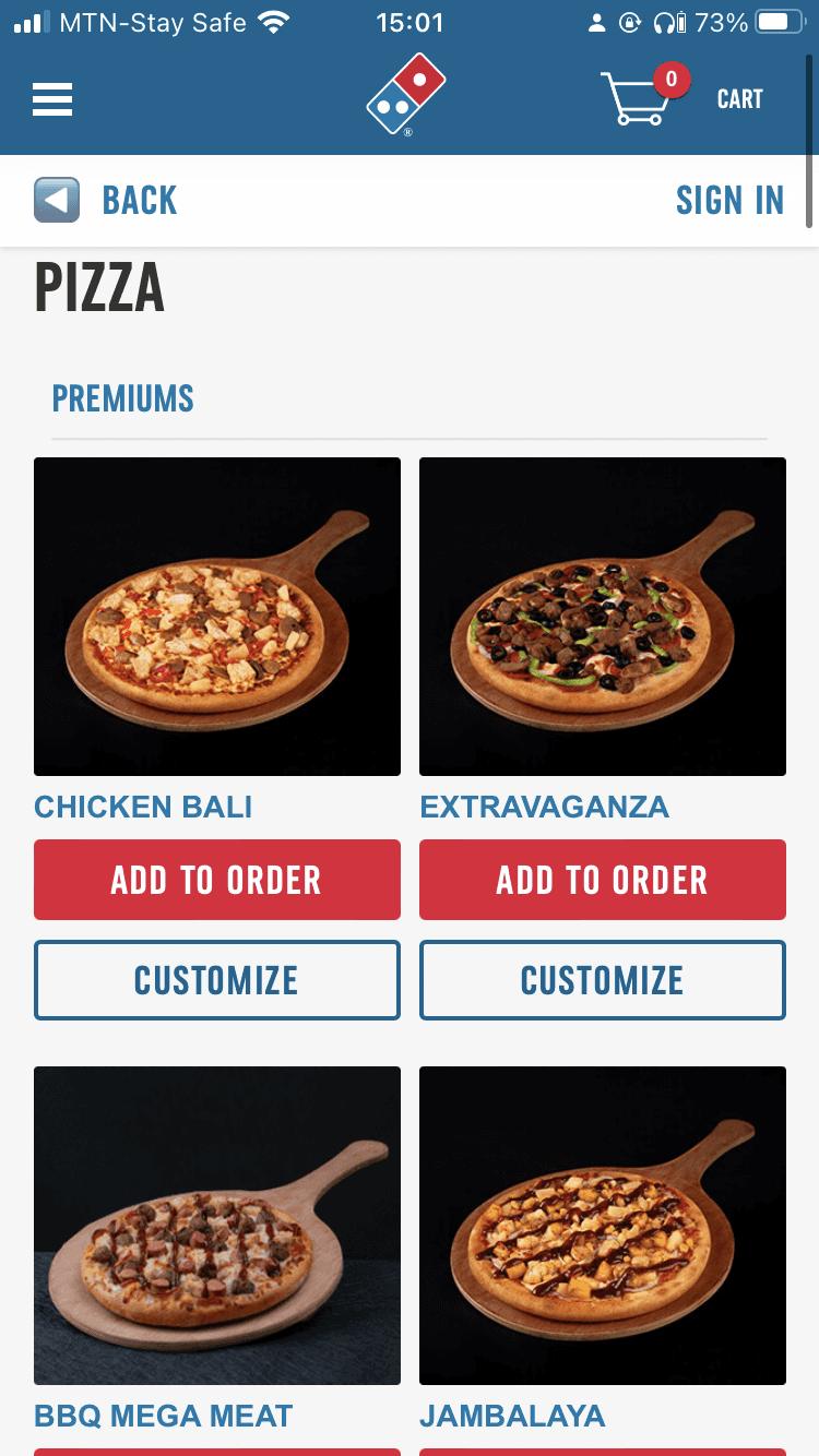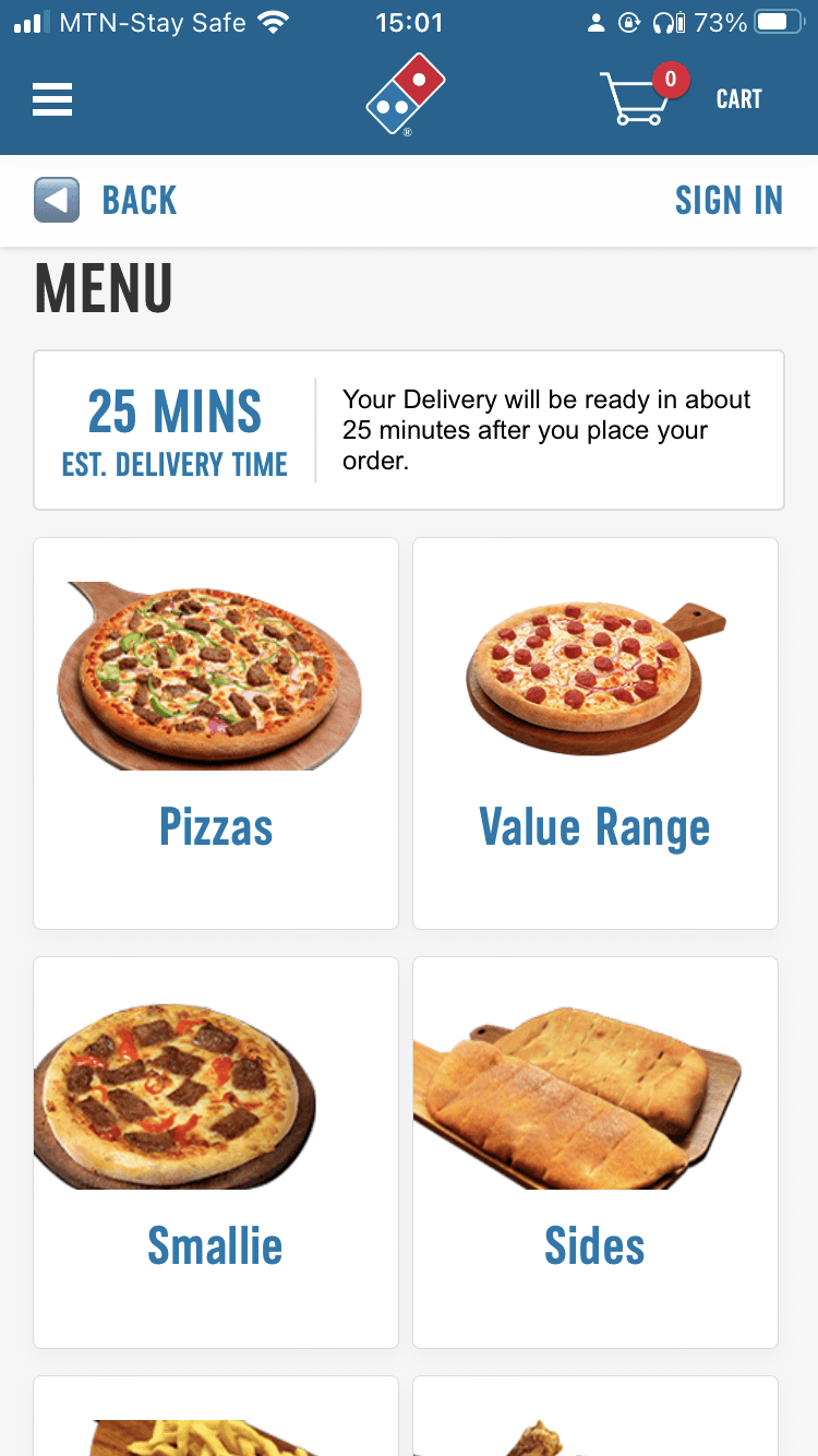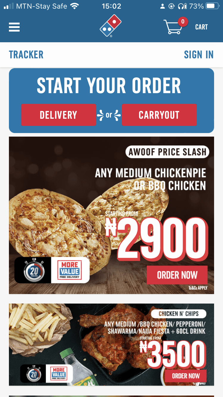 There was a dedicated page each for delivery or pickup options, value deals and the food menu which was time-consuming and challenging to navigate.